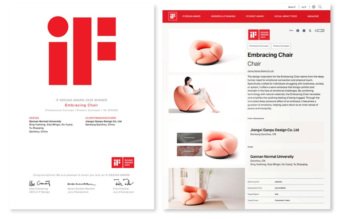 近日,我校美术与设计学院(国家级工业设计中心)丁粤红、肖名希老师设计团队的作品“环抱椅(EmbracingChair)”在2025IF设计大奖(iFDESIGNAWARD)荣获产品概念设计奖,这是我校首次在该赛事中获奖。